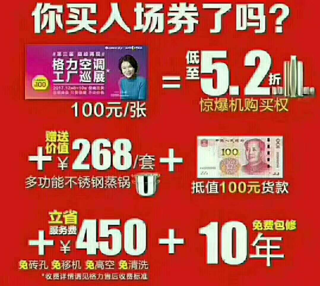 華商空調(diào)又有大動(dòng)作了。。「窳照{(diào)2017年度工廠巡展,董總操盤只要銷量,不談價(jià)格。僅此一次,價(jià)格低到超乎你想象!即日起全面接受認(rèn)籌,當(dāng)天憑入場(chǎng)券可以免費(fèi)領(lǐng)取268元白鋼蒸鍋一個(gè)!享受10年保修,四項(xiàng)免費(fèi)!超低的價(jià)格,超快的安裝,超值的服務(wù),還有一款“會(huì)說話”的空調(diào)等你們來(lái)參觀哦!想買空調(diào)的你們還在等什么?快來(lái)?yè)屬?gòu)入場(chǎng)券吧!!